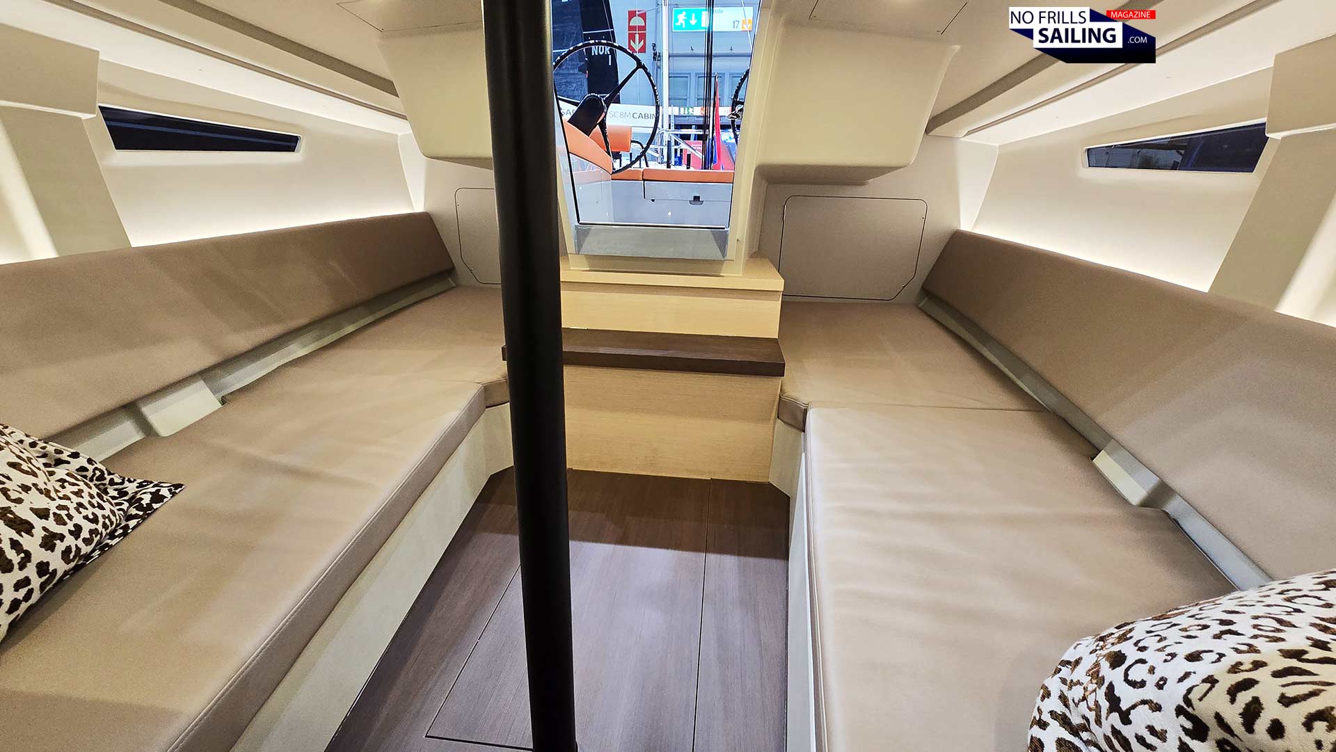 As the “sailing living room” for me perfectly sums up what the 46 is all about, I found it very fitting to call the new 28 Leopard the “sailing sofa”, because that´s what she is in my eyes. Upon nearing her from abaft, what strikes you first and the most is the huge lounge area on the stern. Covering almost a quarter of the whole boat´s length. Everything about this little boat seems to be made in order to maximize … well … lounging. So, let´s start our walkthrough …