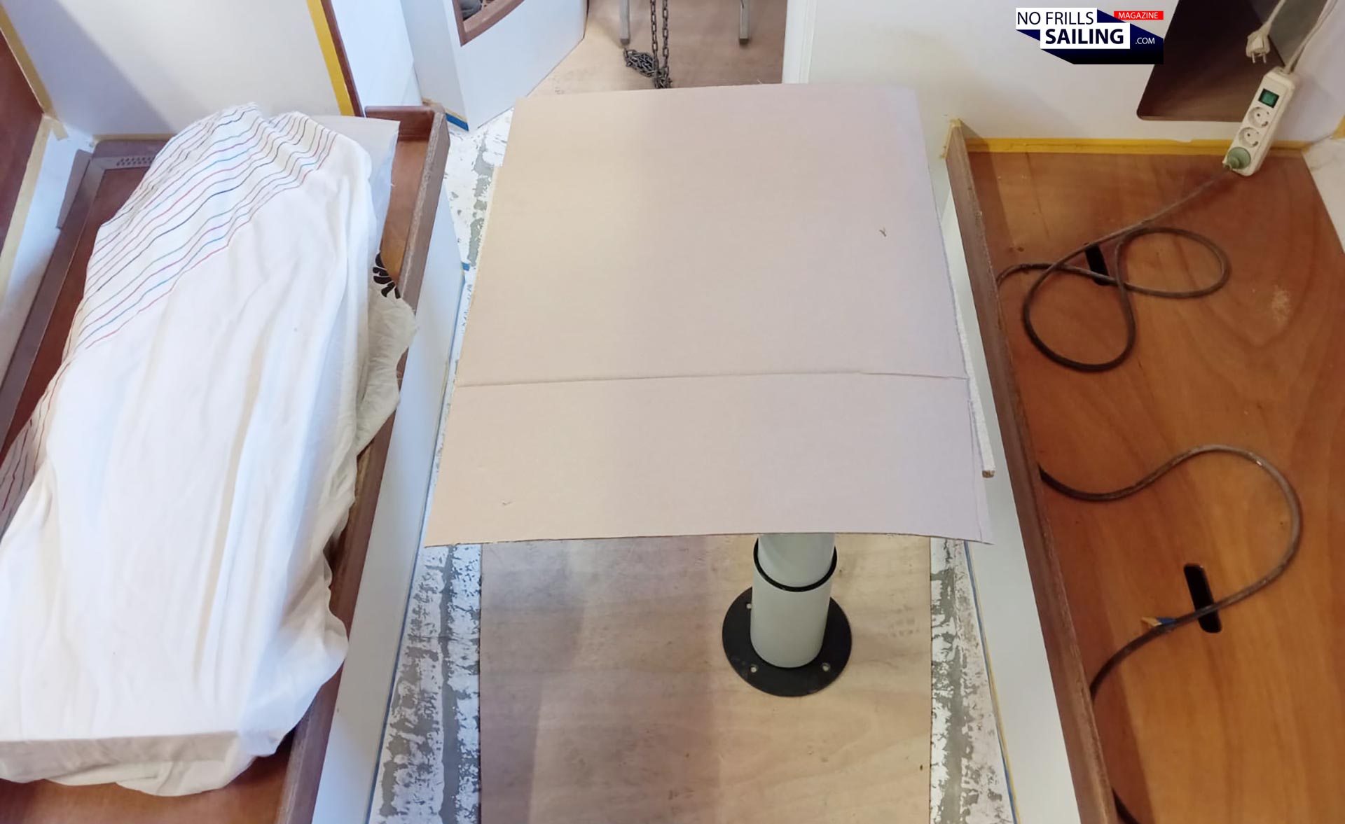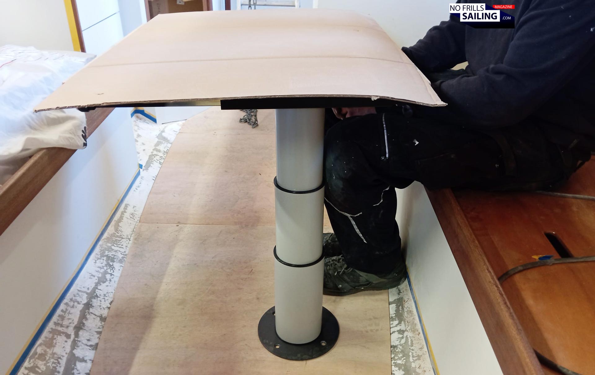 When you buy a yacht, usually, this question has already been answered by the interior designer. According to the shipyard´s brief, most cruising yacht dinner tables are sufficient enough to offer a comfortable amount of table top area for four, six or eight people. Some have integrated extensions if a surprise-party is scheduled, other yachts, like the Hanse 590 are made from the outset to accommodate 10 or more people. I am happy that the Omega 42 building process is fully custom: In this, owners are free to do whatever they want inside. As for the dinner table of my boat, I asked for the smallest possible table top area: I will mostly be sailing single-handed, maybe taking either my fiancé or my kids with me. So, space for two is appreciated, any bigger table top surface would be considered a waste of material – and blocking of precious internal volume. In this, we work with gauge models which in the context of a table is a simple sheet of cardboard that is cut to size.