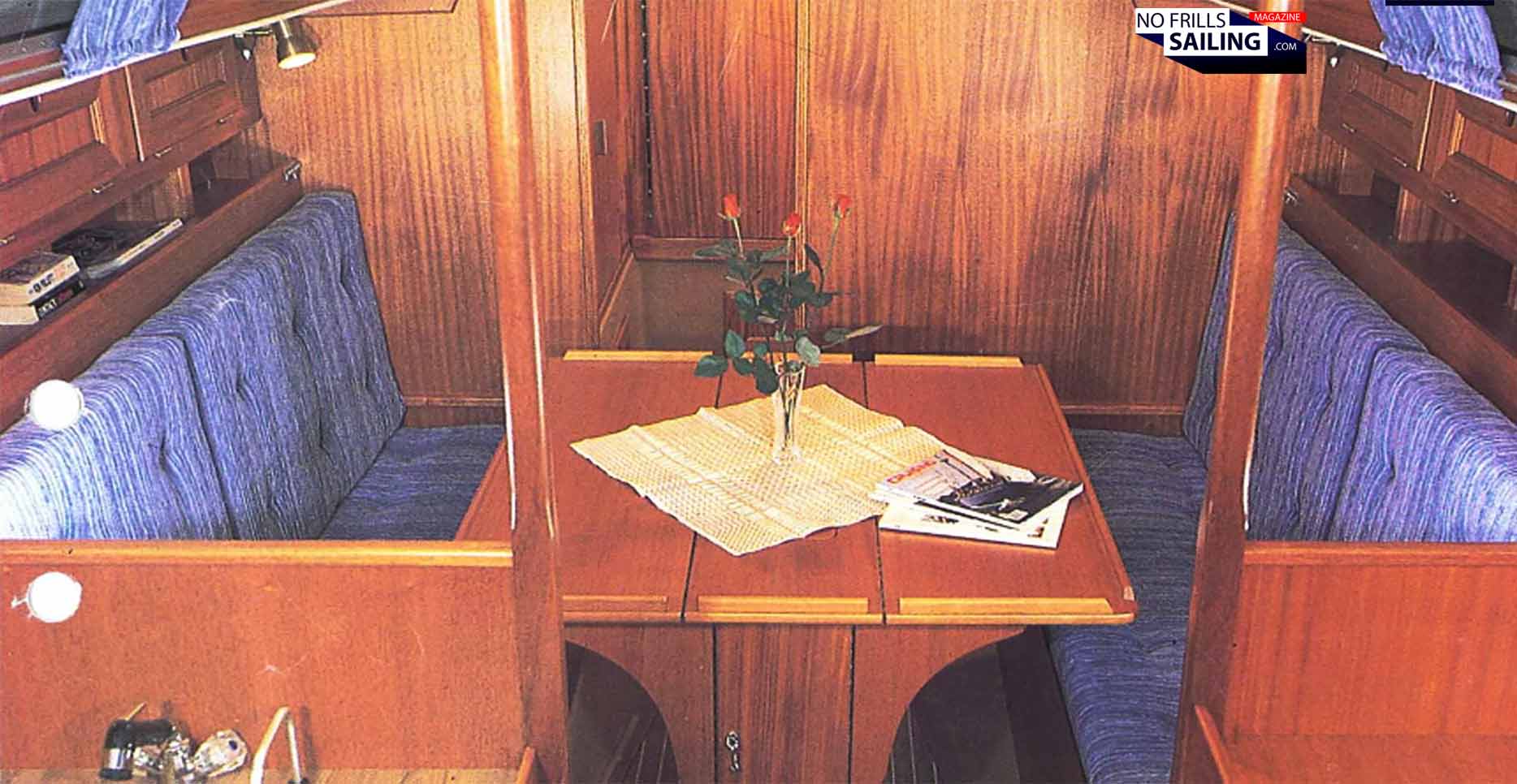 The table is positioned in the longitudinal centerline of the yacht with two equally sized tops. The original Omega 42 salon table is made of massive wood, as you can clearly see. Altogether, the interior back then was quite dark and sported much more stowage than my yacht will have. I simple want to keep the boat as clean an neat as it can be: If there´s stowage, it will surely be used and filled up. Often with unnecessary stuff. I don´t want that.