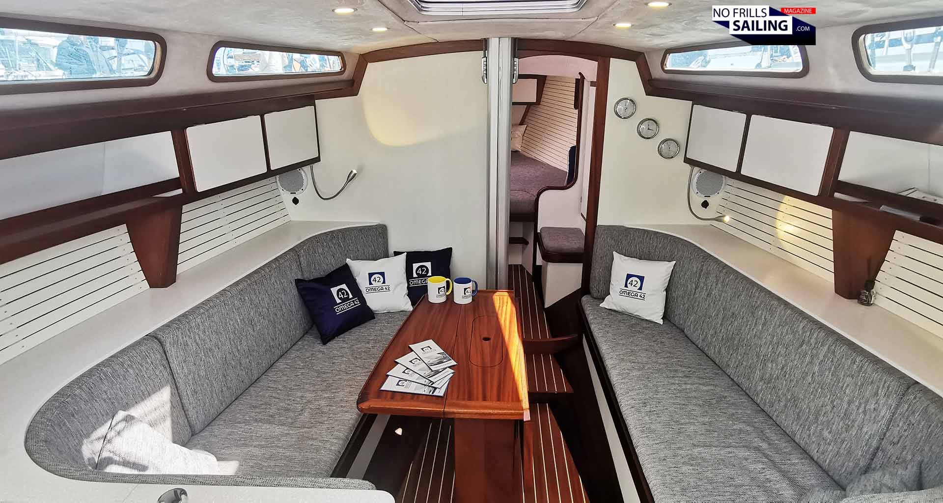 Looking at the finished interior of hull #001 of the new Omega 42 project, Stefan´s WINDFAENGER, it becomes quite clear that the boat has become much, much lighter and brighter in terms of colors but also in terms of narrowness. Stefan´s table still comes in a very classy design language and keeps the same style. Yet, it´s a bit less “bulky” or “heavy” in its appearance. I really like this!